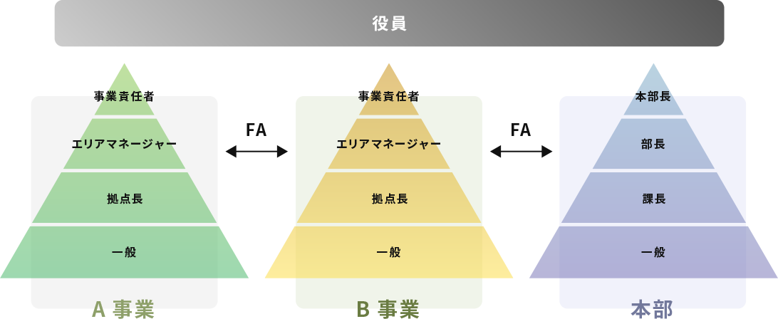 現場採用の方も、本部採用の方も、FA制度による事業部間の異動ができる仕組みになっています。